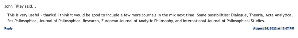 The EuJAP, among others, received an honorable mention in the discussions of the latest Leiter Report poll on “Best “general” journals of philosophy”. Thanks to Dr. John Tilley for putting us in the spotlight with other venerable journals! https://leiterreports.typepad.com/blog/2022/08/best-general-journals-of-philosophy-2022-via-the-condorcet-method.html#comment-6a00d8341c2e6353ef02a2eed282b0200d
